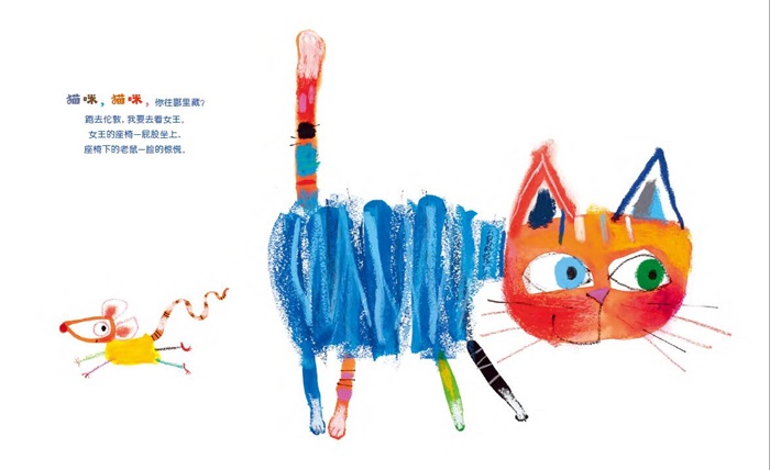 《猫咪,猫咪》中每一首童谣都充满了童趣,孩子读后可以感受到语言韵律和趣味,但是,这还远远不够。童谣图画书的价值还可以指向更高层次,那就是让孩子热爱阅读,提升参与亲子阅读进而是自主阅读的热情。对孩子来说,让他感受到图书和自己生活的联系,这种相关性会拉近他与阅读的心理距离,从内心深处发觉阅读是一件非常有意思的事情。在家庭生活的各种小场景中,爸爸妈妈可以借助《猫咪,猫咪》的童谣,稍加改编,让孩子变身书中的主人公,成为童谣的主角。(摘自学前教育博士刘晓晔《“阅”“玩”越快乐——<猫咪,猫咪>亲子阅读指导方案》)