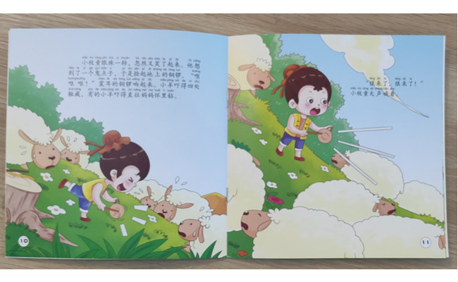 本册内容为《狼来了》,故事讲述的是一个放羊的孩子喜欢说谎,经常喊:“狼来了!”让大家都放下手中的工作去救他。几次三番,大家都不信任他了。当有一天狼真的来了的时候,没人相信他,最后,他的许多羊都被狼咬死了!这个故事告诉我们做人应诚实,不能通过说谎来达到自己的目的,更不能随意愚弄别人。