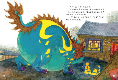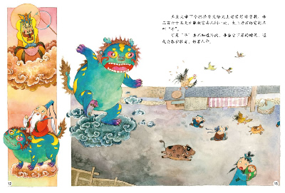 到了半夜,“年”闯进村子。它发现村里有点怪怪的,和往年的感觉不太一样:村东头老婆婆家,门上贴着大红纸,屋内亮着蜡烛,到处都是光亮。“年”很生气,它抖了抖身子,“哇呜”“哇呜”地狂叫着扑向屋子。