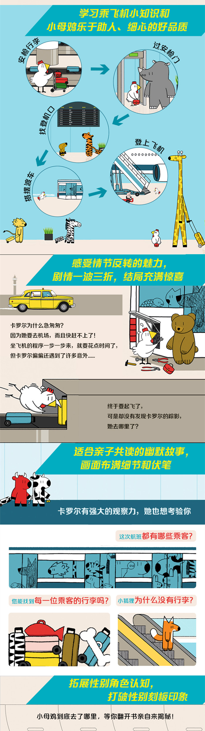 跟着小母鸡学习机场小知识 在幽默的故事中感受情节反转的魅力 打破性别刻板印象 学习乐于助人的善良品质 ◎ 编辑推荐 ★ 跟着小母鸡学习乘飞机的小知识,在反转的剧情中获得惊喜的阅读体验 小母鸡按照规则和步骤一步一步乘飞机,能够让孩子获得关于机场和乘飞机的小知识。曲折的故事情节扣人心弦,能够吸引孩子一直保持好奇和思考地阅读。 ★ 拓展性别角色认知,抛开刻板印象,打破性别壁垒 人们往往对男女两性的气质、角色、行为、职业等方面存在一些固有的看法,也就是性别刻板印象,但它并不是由男女两性的生理决定的,而是由社会文化建构起来的。自古就有女性多应在家相夫教子的传统,但事实上,世界并没有规定哪些事情只能由男性或女性来做,小母鸡卡罗尔在故事里为我们呈现了很多人们偏见里不适合女性从事的事情,这能够为孩子提供一种性别平等、打破偏见的视角。 ★ 学习小母鸡乐于助人、细心、勇...