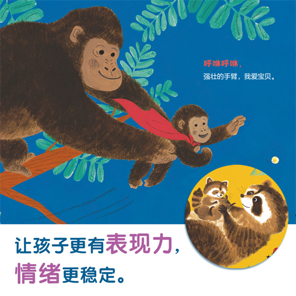 浣熊爸爸给浣熊宝宝挠痒痒。咯吱咯吱~仿佛是玩笑一样的挠痒痒,却是传达爱意的私语。诉说着浣熊爸爸对浣熊宝宝的爱意。 松鼠妈妈为松鼠宝宝吹受伤的尾巴。呼呀呼呀~每一次温暖的呼气都在诉说着松鼠妈妈对松鼠宝宝的爱意。 背着小鸡仔的鸡妈妈、抱着熊宝宝的熊爸爸……它们也是如此,用可靠的后背、用温暖的怀抱,诉说着对孩子的爱意。 美好的爱意充盈在父母对孩子投去的那温柔的目光中,在充满柔情的手中,在温暖的体温中。被爱所包围的孩子的脸上绽放出如旭日般明朗温暖的笑容,被孩子纯真的笑脸所感染,父母的脸上也漾起了微笑。