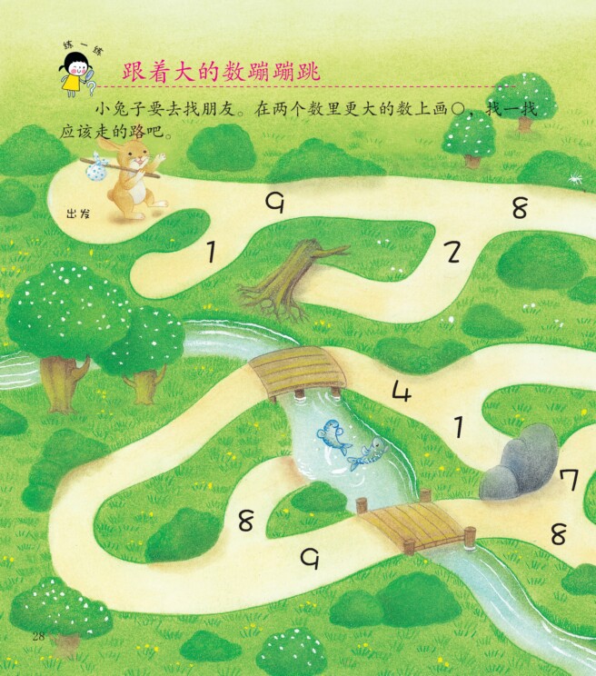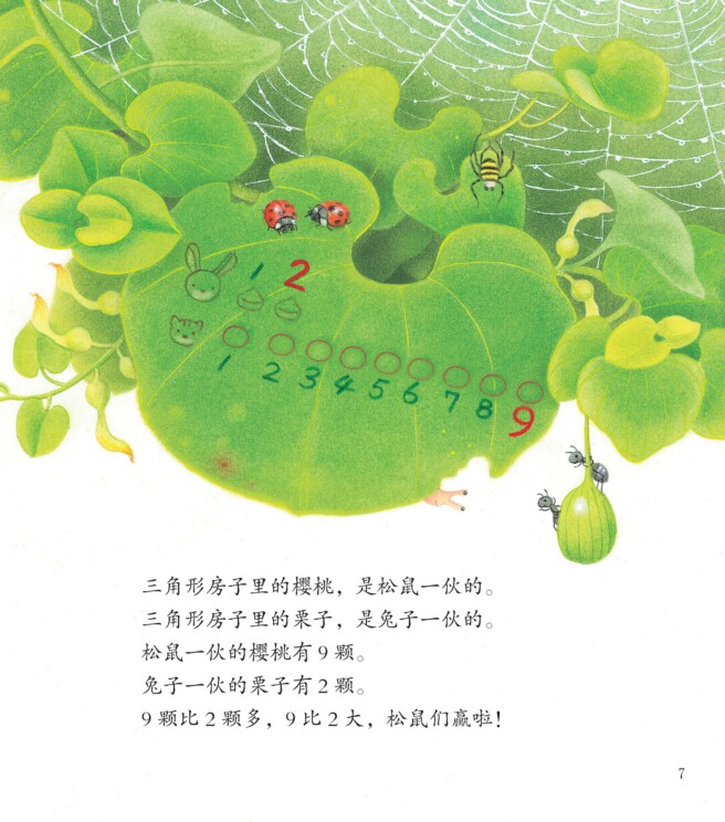 哇,田野里怎么这么热闹?原来小动物们都在比多少:松鼠的樱桃多还是兔子的栗子多呢?青蛙的苇秆儿多还是刺猬的苇秆儿多?小田鼠的陀螺多还是小鼹鼠的陀螺多呢?