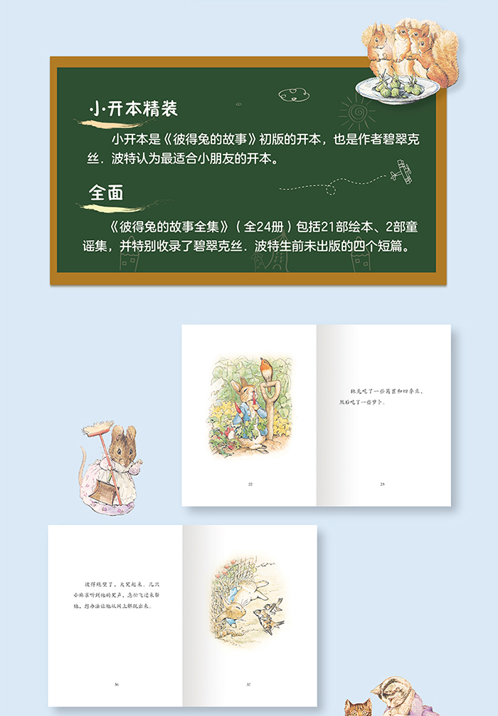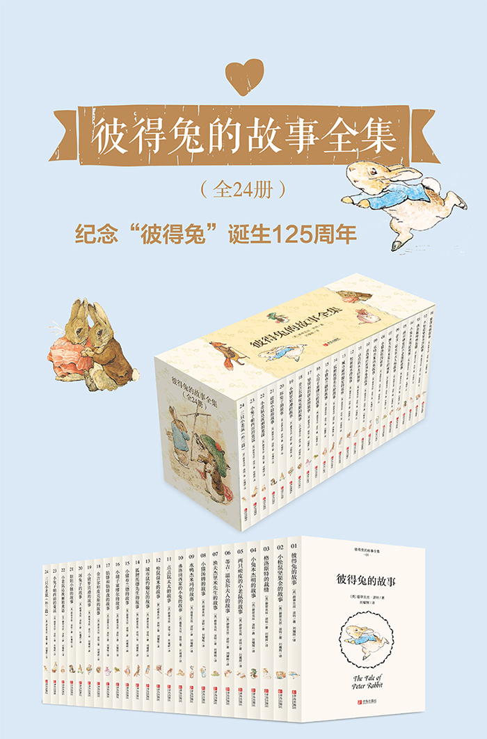 《彼得兔的故事全集》(全24册)采用小开本精装,色彩高度还原,印刷精美,经典再现。附有精彩导读,帮助大小读者更好理解作品之美。