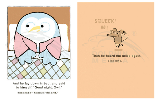 猫头鹰准备睡觉了,他对自己说:“晚安,猫头鹰(good night,owl)!”但每次他刚刚闭上眼睛,就听到房间里奇怪的叫声:squeek!猫头鹰睁开眼睛,在房间里找那个声音的来源。猫头鹰把橱柜、书架、地板统统都翻了个遍,他能找出那个奇怪的声音,然后安心睡觉吗?……猫头鹰将永远不会睡觉,除非他能搞清楚这是怎么回事!也许,一句温柔的由此及彼的“晚安”是让大家都能享受安稳夜晚的魔法……