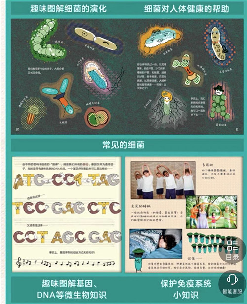 本套书由以色列医生、医学博士查娜·盖贝专门为孩子了解细菌而创作的科普绘本,全4册。从儿童视角出发,以“细菌”为第一人称向读者介绍“自己”及“家族”成员的情况。把细菌及微生物基础知识通过“情景带入”的故事形式呈现出来。系统、生动地展现细菌的概念、细菌的历史及地球生命起源、细菌如何让免疫系统保持健康、细菌如何影响我们日常生活、细菌致病原理等微生物科普知识,传递出讲究卫生、培养健康生活习惯的重要性。《你好,我是细菌》本册书主要介绍了细菌的概念、基本形态、生长环境、基本细菌分类等有关生物细菌的科普入门知识点。采用拟人化的手法,形象、生动、有趣地讲述了小朋友们日常生活中经常遇到的几种细菌。将不同种类细菌以手绘的方式放大呈现,把儿童带到由书本构成的“显微镜”下观看细菌的模样,让他们认识到细菌会藏在哪里、细菌是怎样传播的、要怎样做才能防止细菌等问题。 《细菌的演化》本册书进一步介绍了细菌的祖先、演化方式、演化历程、菌群家族的生活方式、繁衍方式等知识点。通过第一人称讲述告诉孩子细菌之所以难以消除的原因,以及通过什么方式可以减少有害细菌对人体的危害。同时虚构了“菌落镇”,让孩子在看书的时候更有代入感。《会魔法的细菌队长》我们周围到处都是细菌。实际上你体内和身上的细菌比组成你身体的几十万亿个细胞还要多得多。本册书通过介绍细菌在人体中的作用和活动过程,描绘细菌是如何作用于人体,并给孩子揭示生病和细菌的关系。还有告知孩子“保护免疫系统”小贴士,培养其健康生活好习惯。《超级强大的细菌指挥家》细菌这个大家族在“细菌艺术大师”DNA的领导下,总是及时出现,竭尽全力,保证我们身体里的一切有条不紊,和谐运作。本册书在前三册的基础上,进一步讲述了细菌系统中比较重要的DNA、微生物组等知识点,同时还介绍了DNA是如何影响人类遗传、DNA内部的结构、细菌如何影响人类基因等近年来的新知识,语言简单俏皮,孩子能够在插画的代入下了解到这些知识点。手绘插画搭配真实场景的照片传递出讲究卫生、培养健康生活习惯的重要性。