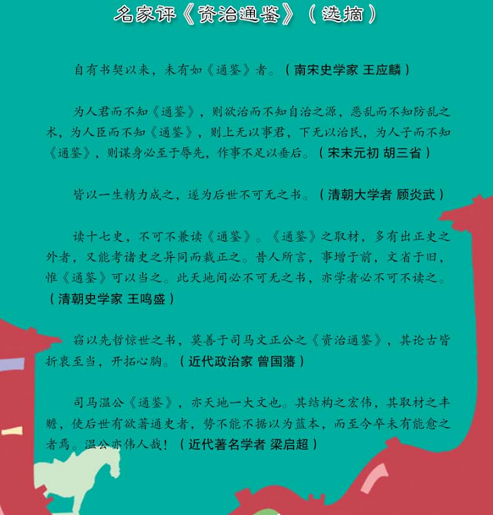 柏杨对历史事件提出了自己的思考,与司马光的观点针锋相对,同时收录了司马迁、班固、陈寿、孙盛论、赵翼、梁启超等历朝历代史学家的点评,为孩子再现名家论坛。