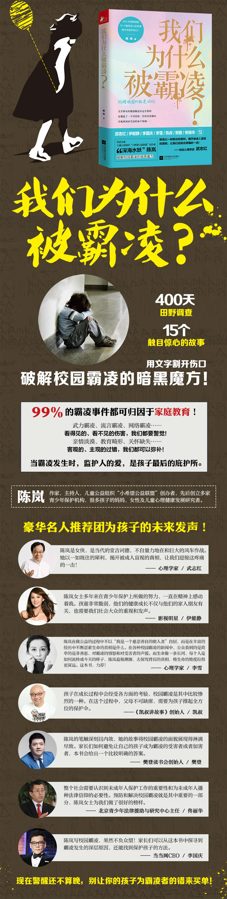 《我们为什么被霸凌?》经过400天田野调查,呈现了15个触目惊心的校园霸凌故事,横跨小学、初中、高中、大学四个阶段,涵盖武力霸凌、流言霸凌、性别霸凌、群体霸凌、校园霸凌等多种形式,揭示了99%的霸凌事件都可归因于家庭教育!