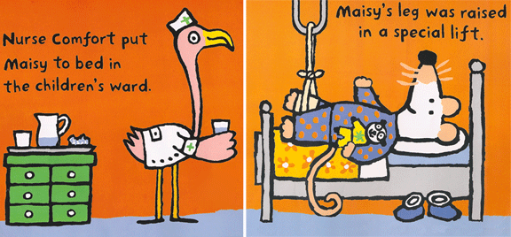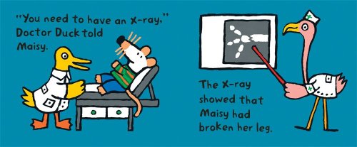 The perfect prescription for preschoolers who may be visiting the hospital -- and a healthy story-time choice for Maisy's loyal fans. One day as Maisy is bouncing on her trampoline, she bounces a LITTLE too high. Oh, no What will happen after she falls and hurts her leg? Maisy's friend Charley goes with her to the hospital, where X-rays, a cast, and an overnight stay ensue. Maisy feels strange to be away from home, but a friendly patient soon helps her feel better. Little readers will be relieved and intrigued to share a memorable -- and perhaps familiar -- experience with Maisy.