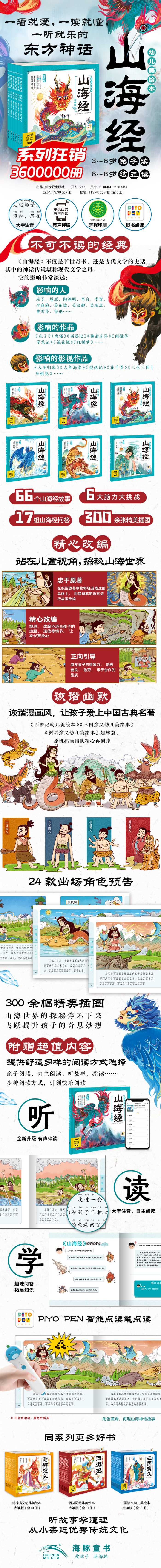 《山海经》是一部内容丰富、风貌奇特的古代佳作,堪称中国奇幻、魔幻文学的开山鼻祖。这部中国上古时代集奇幻与瑰丽之大成的想象之作,深刻反映了上古时代种种神话传说,是值得珍藏的一本书。 《山海经幼儿美绘本》作为专门为3~8岁孩子量身打造的名著启蒙读物,是一套适合孩子自主阅读以及亲子共读的优秀读物,旨在为孩子打开经典学习之门,让孩子摆脱对文学著作的畏难情绪,轻轻松松爱上名著。全书分为6册,包括古神、英雄、山川、奇国、异兽、鸟鱼六大主题,每册11个故事,在尊重原著的基础上,根据3~8岁儿童的阅读理解力进行改编、创作,趣味的童话故事形式,配以彩图、注音以及有声音频,让孩子从小感受中华传统文化的魅力,在神秘的山海世界中激发阅读兴趣和想象力。每册贴心设置文前出场预告简介、文后山海经知识拓展,帮助孩子厘清故事脉络,积累山海经知识点;分角色有声伴读,让故事角色更生动;添加音乐及特制音效,提供沉浸式阅读体验,寓教于乐的山海经趣味问答、智力科普游戏等环节。