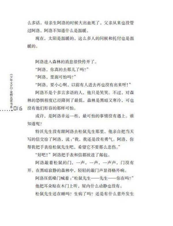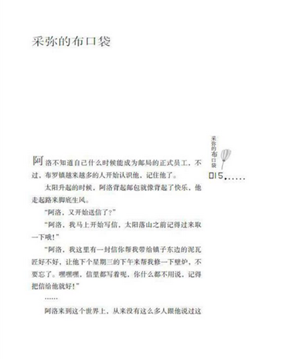 布罗镇是个很小很小的镇子,在地图上就是一个小小的黑点。 阿洛是个没爹没娘的孩子,长得瘦瘦弱弱。 到了邮局之后,他就在邮局里面守着柜台,整天呆呆地坐着。 日子久了,阿洛羡慕的人越来越多。不过他*羡慕的,还是邮局里真正的邮递员。什么时候,他也能成为一个真正的邮递员呢? 这是一个充满浪漫温暖温柔想象的童话作品,讲述了一个孤儿阿洛,如何以自己的善良,赢得小镇居民的信任和尊重,而成为一名出色的邮递员,并且用自己的力量,拯救了面临洪水的小镇,化解了小镇居民和森林居民的宿怨,重新互相帮助,成为和谐共处的一个大家庭。本书除了有好看的故事,其蕴含的人与自然和谐共处的思想也让作品有了更深的思想内涵,是小学生打开想象之门,学习纯美文字表达、感受自然生机的童话佳作。