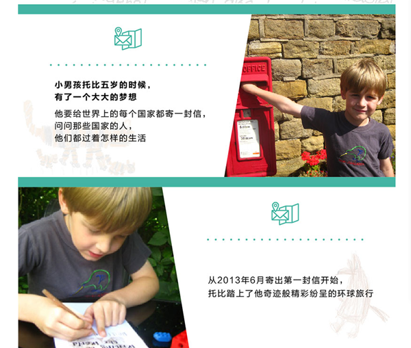 小男孩托比五岁的时候,有了一个大大的梦想。他要给世界上的每个国家都寄一封信,问问那些国家的人,他们都过着怎样的生活。 从2013年6月寄出第一封信开始,托比踏上了他奇迹般精彩纷呈的环球旅行。托比给世界上每个国家的人都写了信,从夏威夷火山镇到斯瓦尔巴群岛,从危地马拉到马达加斯加,从南极洲到国际空间站,小小的手写信件穿越空间、地域、种族与文化,送到各种各样的人手中:小学生、家庭主妇、全世界游历的考古学家、国家野生动物园管理员、国际太空站航天员、南极科学家、英国驻蒙古大使、帕劳*长、伊拉克难民营里的小男孩、第一个找到“泰坦尼克”号残骸的海洋探险家……男孩探索着世界,世界给了他温柔的回应。