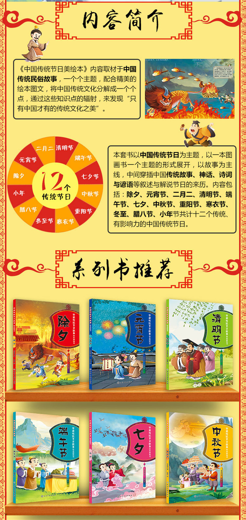 “中国传统节日绘本游戏书”内容取材于中华传统民俗故事,一个个主题配合精美的绘本图文,将中国传统文化分解成一个个知识点,通过这些知识点的辐射来发现中国的传统文化之美 。每一个节日,都附一组中华民俗知识点,富有知识性、教育性和启发性,让孩子深入了解中国的传统文化。