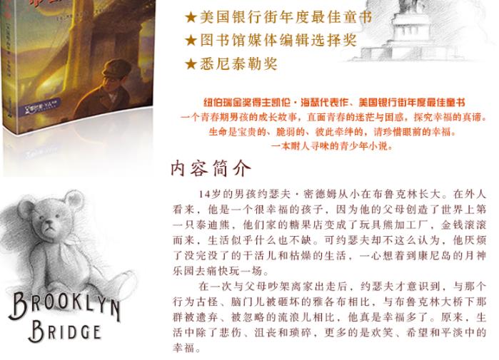 简言之,《布鲁克林大桥》既是一个令人难忘的纽约传奇,也是一个令人低徊不已的人间故事,更是一本耐人寻味的青少年小说,非常值得推荐。
