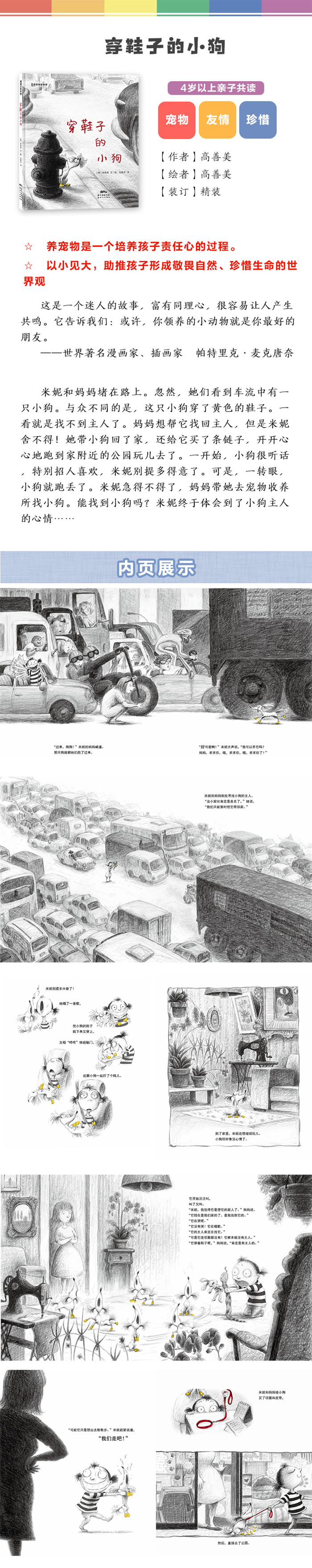 前 言 在众多以养宠物为主题的绘本中,《穿鞋子的小狗》令人眼前一亮。 其一是它的画面用色。以黑色铅笔为主,中间有黄色和红色穿插,形成点睛之笔。而这两处用色也有深意可品。比如,小狗穿的是黄色鞋子,而米妮给它买的皮圈和皮带是红色的。在颜色层面寓意“米妮不是它原来的主人”。 其二是故事节奏明快,米妮和小狗的动作表情非常生动。比如米妮带着小狗去公园玩的时候,一开始特别开心得意,但当发现小狗又跑掉了的时候,她的表情非常夸张,但又惹人怜爱。因为正是在这个过程中,米妮体会到了小狗原主人的心情,也明白养宠物意味着责任心,而不是一时的虚荣。 这个故事与我们的生活相贴近,非常适合4岁以上孩子阅读。既好玩又有教育深意,寓教于乐。