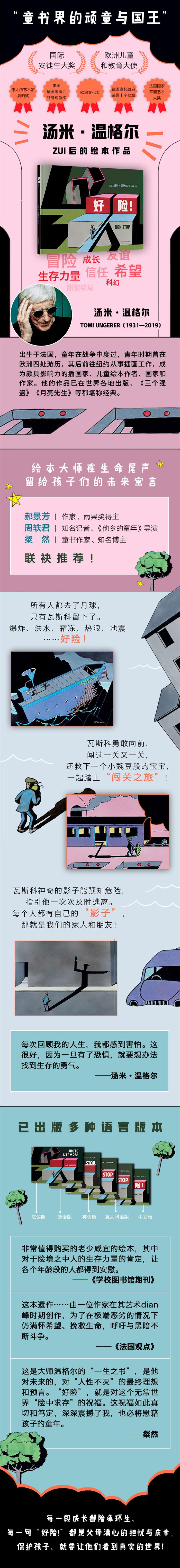 1. 国际安徒生奖得主、绘本大师汤米·温格尔遗作,雨果奖得主郝景芳、《他乡的童年》导演周轶君、童话作家粲然联袂推荐! 2. 如何告诉孩子,看似和平的世界也有危机重重的一面?在《好险!》里,汤米·温格尔描绘了一个世界末日般的景象,在这景象之内,是汤米·温格尔倾注一生的勇气与希望,为孩子们写下的一则震撼人心的未来寓言。保护孩子,就要让他们看到真实的世界! 3. 当世界停摆,如何教会孩子,面对危险更需要勇往直前?《好险!》里主角瓦斯科面临空无一人的险境,勇敢向前,并且帮忙送信、救助了一个孤儿,故事充满生存的力量和人道主义关怀。 4. 故事里神奇的“影子”,带来如游戏闯关般的趣味体验。《好险!》里每当瓦斯科即将遇到危险,他的影子都会及时指引他逃离。这个“影子”隐喻着每个人身边的家人、朋友,汤米借由“影子”告诉孩子们,无论身处何种困境,别害怕,“影子”会始终陪伴在身边,指引着我们穿越险境,走向甜蜜的未来。 5. 童书作家、知名博主粲然评论: 孩子喜欢把一切可能性推演到ji致,再去设想突围空间。这使每一段成长都高潮迭起、险象环生。汤米·温格尔《好险!》暗合了“成长主义”狂飙突进的节奏,是以能一开始就吸引孩子的目光。 然而,这本书震撼人心的力量远不仅于此。温格尔离世之前,以大师手笔,暗喻人性在这个充满不确定性世界的“闯关之战”:孤独和突变常随左右。然而,你的身体里会滋生出引导自我的力量,如影随行,带你走出险境,寻获陪伴,终得平静。 从这个角度说,这是大师温格尔的“一生之书”,是他对未来的,对“人性不灭”的蕞终理想和预言。 “好险”,就是对这个无常世界“险中求存”的祝福。这祝福如此真切和笃定,深深震撼了我,也必将慰藉孩子的童年。