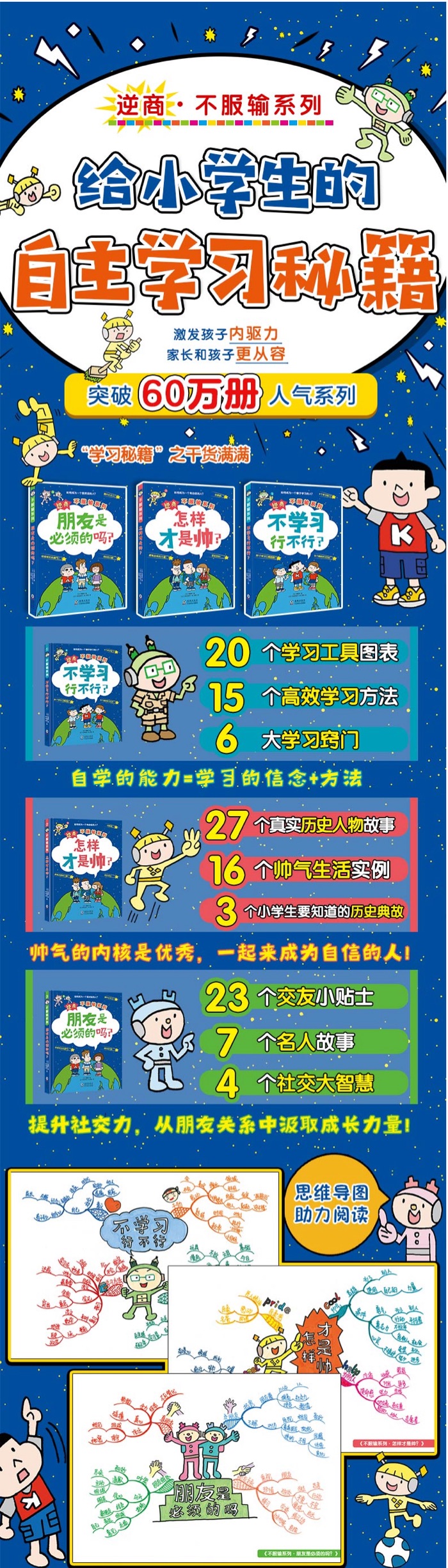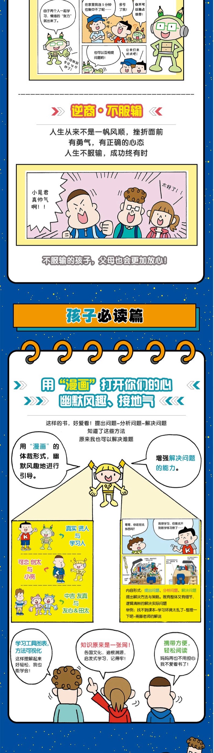 不服输系列是日本引进,作者写给6岁以上孩子的漫画书,分别从学习方法、培养自信以及交朋友三个方面进行了具体阐述,通过漫画的方式,用轻松有趣的语言,让孩子们在阅读的同时学习到解决烦恼和问题的方法。这本书的主人公是一名小学四年级的学生友真,性格非常的内向,不擅长与他人交流,唯一的朋友就是从小一起长大的朝阳。友真也渴望结交新朋友,他通过小外星人的帮助,在学校结交了很多好朋友,其实交友也需要有技巧哦。什么是朋友?人为什么需要朋友?你认为是朋友的人,也把你当朋友吗?这些问题,不知道你之前是否有过思考。四年级的小学生友真内心非常希望能够交到更多的朋友,通过在生活中的实践,他发现交到好朋友也没有那么难,只要勇敢的再向前迈出一步,就有收获。