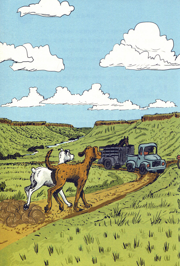 我们飞快地朝着那辆身份不明的小货车跑去,在跑向畜栏的一路上不停地吠叫着。就当我准备嗅出轮胎的味道,为它们做个记号,以备将来所用时,另一辆小货车也驶了过来,接着又是一辆!