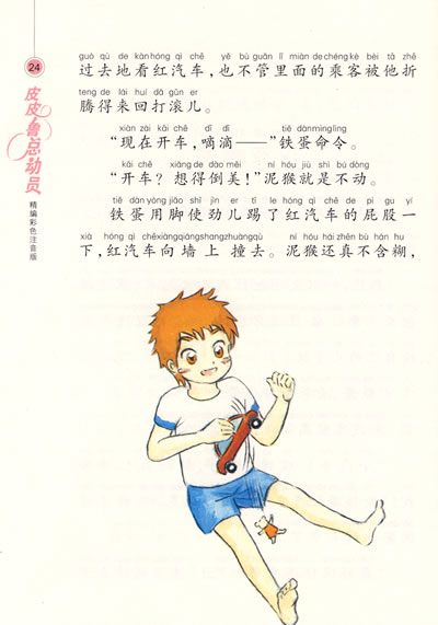他们悄悄来到玩具红汽车旁边,泥猴打开了车门,坐在了驾驶员的位置上。一番折腾后,红汽车飞一样地跑起来了,泥猴还在拼命地踩着油门。