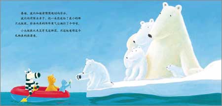 《泰迪波比和迪兹的第一次冒险》:晴朗的一天,小熊泰迪、波比和小斑马迪兹三个好朋友一起到海边玩。他们划着小皮艇来到大海上,遇见了一块浮冰上的北极熊一家和一只小海豹,大家成了好朋友,一起玩耍。玩着玩着,浮冰突然裂成了两块,还变得越来越小了。但是小皮艇根本装不下所有人。这时,泰迪灵机一动,划着小皮艇找来鲸一家帮忙送北极熊一家和小海豹回家,而浮冰也化成了水。最后,三个好朋友划着小皮艇又遇见了一块更大的浮冰,上面有许多企鹅。
