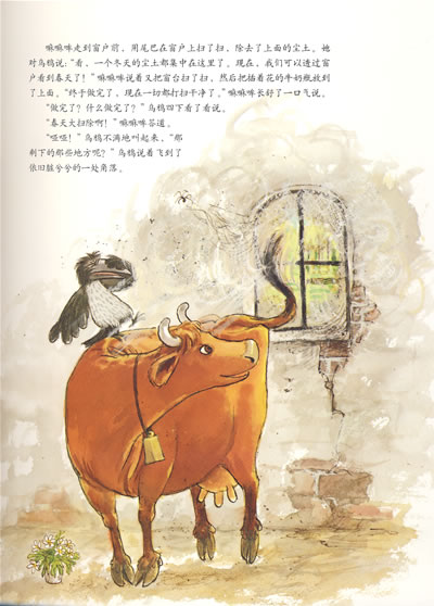 这个童话的主人公是一头有点不同寻常的小牛,她看到了牛圈外的世界,而且勇敢地走出去了。尽管她的好朋友乌鸦总是不断地提醒她:她只是一头牛,可她就是不相信人类小朋友能做的事情她却不可以做,难道就因为她是一头牛吗,乌鸦就像个墨守成规的成年人,而小牛却是个充满梦想的孩子。有趣的是,在小牛的影响下,乌鸦不知不觉地做了小牛的好帮手!