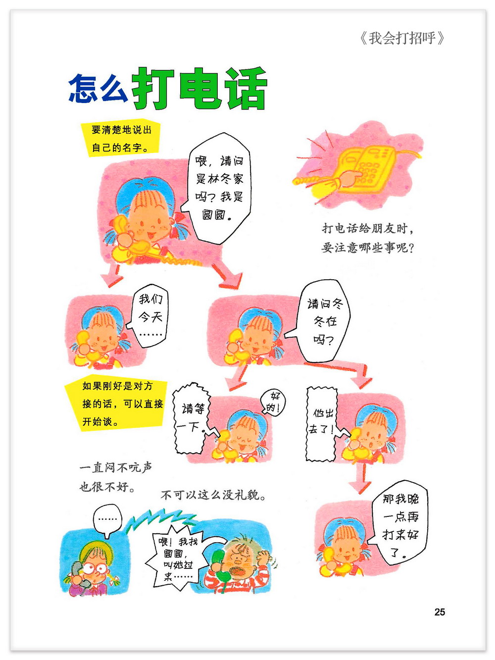 主要内容:哇!天亮了—— 起床后应该说什么——饭前、饭后应该说什么——上学前应该说什么——到了学校应该说什么—— 老师点名的时候要说“到”——对不起和谢谢——在日常生活中,要常说“请”——再见和我回来了——客人来时应该说什么—— 出去玩之前应该说什么——怎么接电话——怎么打电话—— 睡觉前应该说什么——其他的问候语—— 遇到这些情形应该怎么做—— 给老师和父母的话