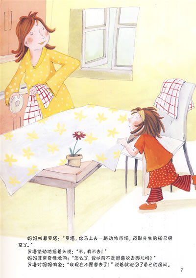 罗塔很清楚地知道自己生气了,就像碰到了动物市场的售货员一样,所以罗塔不愿意去动物商店里买东西,还有在她洗澡的时候她的姐姐没有敲门就进去了,在亲戚聚会上,所有的阿姨都想亲她:有许多种情况,都是罗塔必须碰到的。但是,最后罗塔非常清楚自己不愿意做什么,当她不愿意做什么的时候,她就会鼓足勇气拒绝。所以罗塔很勇敢地对动物商店的售货员说:“不,你不能亲我!”