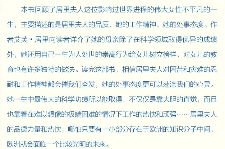 我有幸在很早的时候就读到了《居里夫人传》,它带给我的勇气和力量远远超过了我的想象,她真的非常了不起。