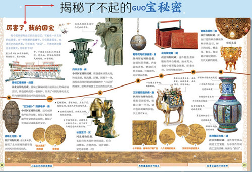 一个对页讲述一个完整主题。 既保证了阅读的连贯性,让孩子随时打开一页都可以获取完整的独立知识点,又能让页面充满表现力,牢牢吸引孩子注意力。 比如亚洲原来被称为“亚细亚”,意为“东方日出之地”。 亚洲也是七大洲里当之无愧的老大。首先,它的面积最辽阔,约有4400万平方千米,占了地球陆地总面积的1/3。 其次,亚洲东西距离最长,跨纬度最大,从东到西有整整11个小时的时差。同一时间,有的国家星河灿烂,有的国家则暖阳高照。 各种各样的地形奇观:飞流直下的瀑布、宛如丹霞的五彩地貌、清澈秀丽的火山湖、深不见底的峡谷……别说孩子了,大人看了也爱不释手! 从商朝、战国到明清时期的宝物跃然纸上,画面清晰便于观赏。给孩子拎出来不少考点知识,比如清明上河图里的“十千脚店”,是中国最早的灯箱广告; 还有《国家宝藏》里重点介绍的宝物金瓯永固杯。 不止是有中国宝物,还能参观国外的大英博物馆、法国卢浮宫等。