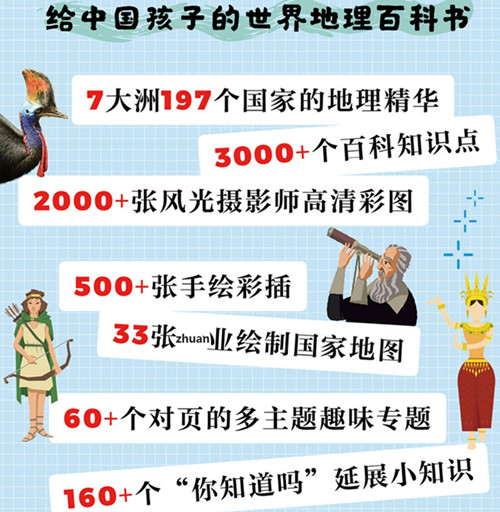 6岁+的孩子完全可以独立阅读,培养阅读兴趣、提升知识储备; 12岁+的孩子既能增长见闻,又能作为地理、历史、生物的课外辅导书。知识点轻松记,考试不焦虑。 孩子不管是学习地理知识、历史知识,还是积累作文素材,都可以用国家名称为索引,对号查询。方便快捷,内容丰富。 满屏干货的“对页主题”设计,分分钟给孩子感受沉浸式阅读的快乐。 一个对页讲述一个完整主题。 既保证了阅读的连贯性,让孩子随时打开一页都可以获取完整的独立知识点,又能让页面充满表现力,牢牢吸引孩子注意力。