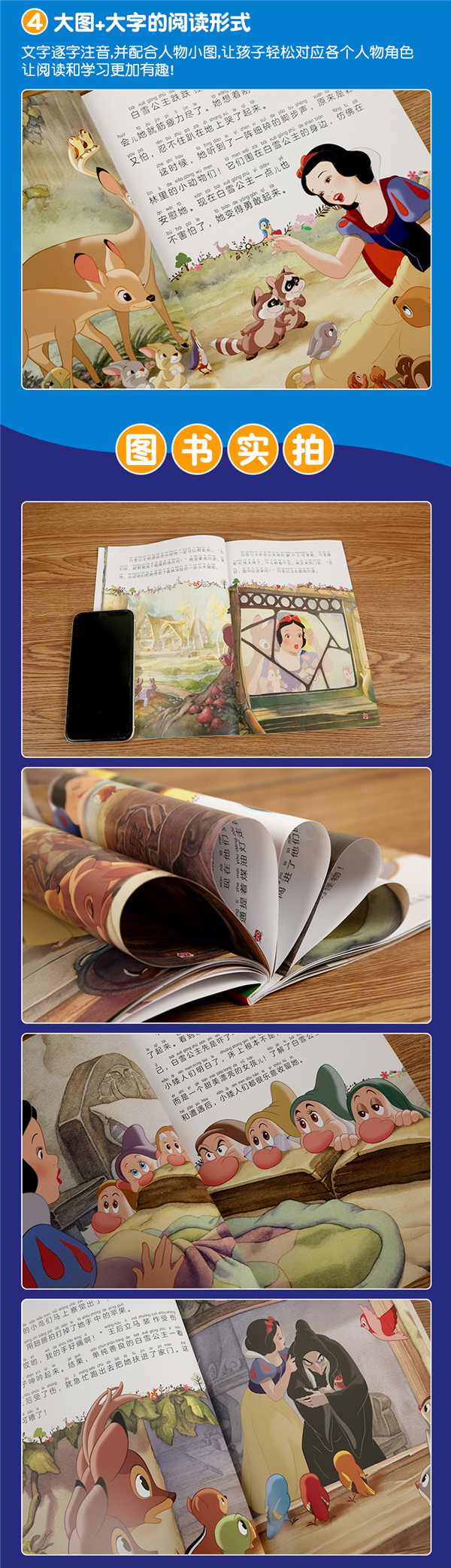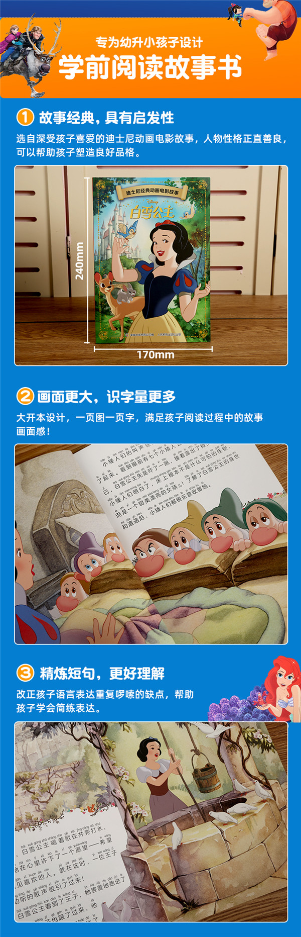 1.迪士尼官方正版授权,20个经久不衰的经典品牌,20本充满真善美的正能量故事,让孩子的童年从阅读经典开始,让迪士尼陪伴孩子成长的每一天。 2.全文加注拼音,适合学龄前孩子阅读,在充满魔法的童话故事中识字更易培养阅读兴趣,丰富亲子阅读时光。 3.采用精致美绘大图,大篇幅的精美绘图能够吸引小读者的注意,明亮活泼的色彩加上精妙绝伦的画工,打造美观至极的童话场景,让小朋友身临其境地进入童话世界。 4.本套书采用小全开规格,精致轻巧不笨重,精彩故事可以随身携带,也方便孩子的小手翻阅,让宝宝的阅读随时随地开始。 5. 优越的性价比,全书采用质感纸张,精心细节页页可见,以美丽的价格打造华丽的阅验体验。"
