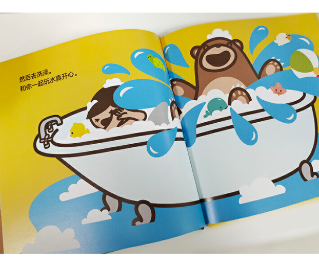 小男孩从游泳池走进卧室,又发现一只大熊趴在他的床上。他叮嘱大熊不要动他的玩具,然后去吃晚饭了。 当他回到卧室,发现大熊把玩具弄得满屋子都是……小男孩耐心地教小熊整理好玩具,再一起洗澡、刷牙、睡前阅读,一起进入甜甜的梦乡。