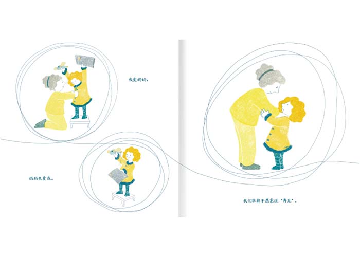 小女孩马上要和父母移民到国外生活了……在出发之前,她要去和奶奶说一声再见。在缝纫间里,奶奶忙着给女孩缝制衣服,而小女孩用布头和蓝线给奶奶缝制了一张地图,一架飞机,等到冬天来临,湖面结冰的时候,奶奶就会凭借这两样东西找到她。奶奶安慰小女孩说,不管我们相隔多远,你我之间都有一条长结实的线把我们相连。