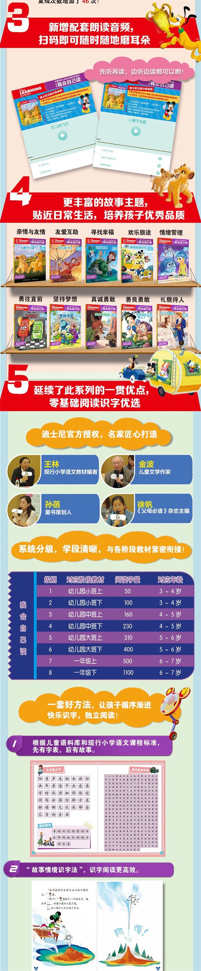 《迪士尼我会自己读第5级 阅读加强版》,共10册,每册包含2~3个故事,故事的语言简洁有趣,便于孩子理解和记忆。全套故事均配有生动的音频朗读,让孩子随时随地听故事学汉字,确保孩子阅读能力稳步快速提高! 经典的迪士尼人物形象,富有画面感的人物言行能与孩子产生强烈的共鸣,是孩子合适的阅读伴侣。 形式多样的游戏测试页,使儿童在快乐的游戏中完成对阅读的自我检测,并有助于提高孩子的语言表达能力。 每册另附本级重点字和荣誉证书,便于孩子自我督促和自我激励,收获满满的成就感。 美丽独特的姐妹花安娜和艾莎、赛车技术高超的闪电麦坤、聪明伶俐的小兔子朱迪、住在小姑娘莱莉脑海里的情绪小人儿、来自怪兽大学的毛怪和大眼仔、爱读书的贝儿公主、白雪公主和七个小矮人……众多迪士尼经典明星陪伴儿童走进阅读的美好世界。阅读启蒙从迪士尼我会自己读开始!
