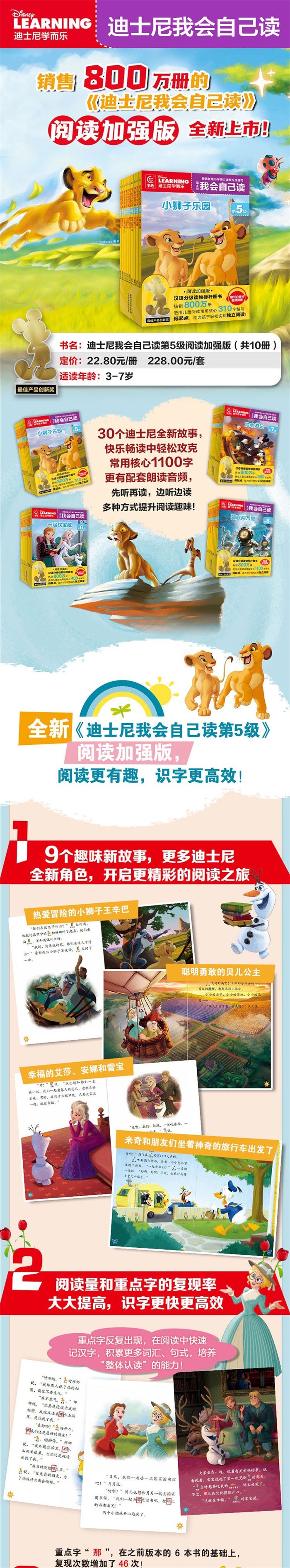 《迪士尼我会自己读第5级 阅读加强版》,共10册,每册包含2~3个故事,故事的语言简洁有趣,便于孩子理解和记忆。全套故事均配有生动的音频朗读,让孩子随时随地听故事学汉字,确保孩子阅读能力稳步快速提高! 经典的迪士尼人物形象,富有画面感的人物言行能与孩子产生强烈的共鸣,是孩子合适的阅读伴侣。 形式多样的游戏测试页,使儿童在快乐的游戏中完成对阅读的自我检测,并有助于提高孩子的语言表达能力。 每册另附本级重点字和荣誉证书,便于孩子自我督促和自我激励,收获满满的成就感。 美丽独特的姐妹花安娜和艾莎、赛车技术高超的闪电麦坤、聪明伶俐的小兔子朱迪、住在小姑娘莱莉脑海里的情绪小人儿、来自怪兽大学的毛怪和大眼仔、爱读书的贝儿公主、白雪公主和七个小矮人……众多迪士尼经典明星陪伴儿童走进阅读的美好世界。阅读启蒙从迪士尼我会自己读开始!