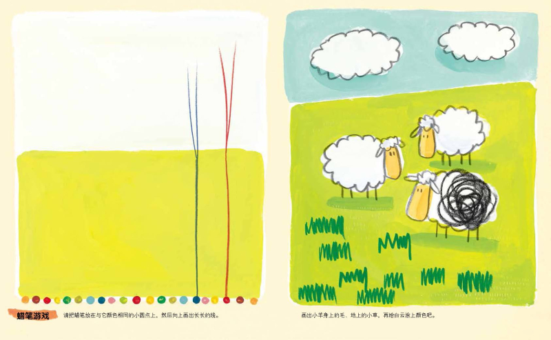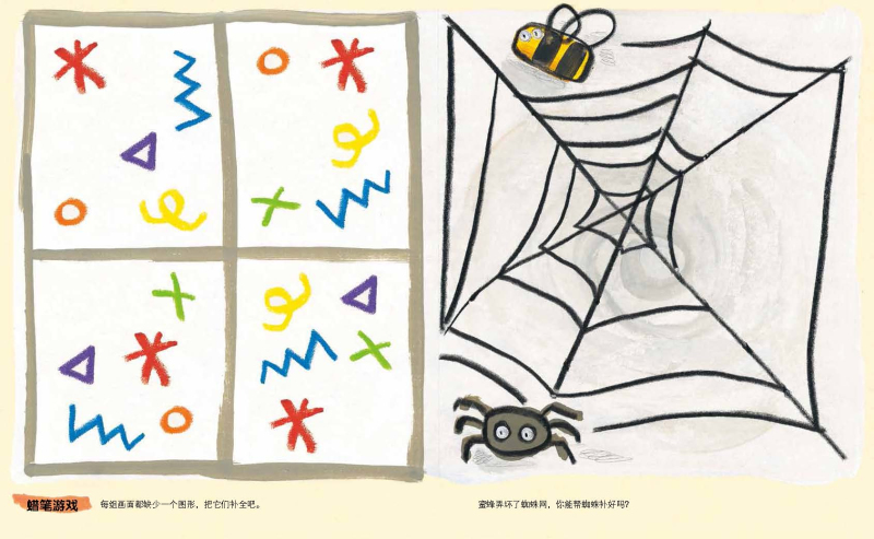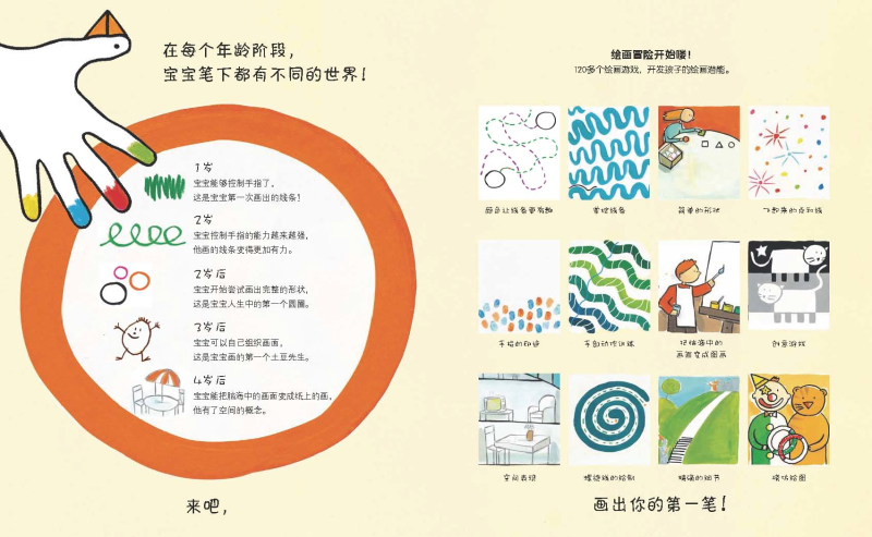 在“玩”绘画的过程中,宝宝们可以充分观察和感受书中预创的情境,进而激发解决问题和艺术创想的能力,最后通过运笔来实践自己的艺术遐想。宝宝们每画出一个点、一条线都是充分调动大脑神经元,协调运用脑、眼、手的结果,更是艺术感知力和想象力提升的表现。