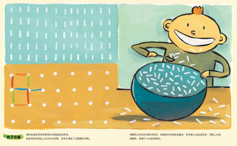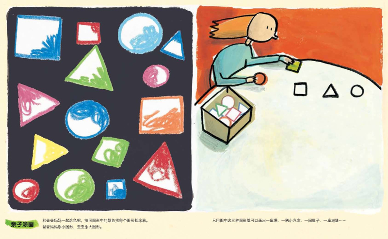 此外,书中还特意编排了“亲子涂画”的环节,让爸爸妈妈们融入宝宝们艺术启蒙的过程中。因为家长的亲身参与和陪伴,是对宝宝最大的肯定和激励。
