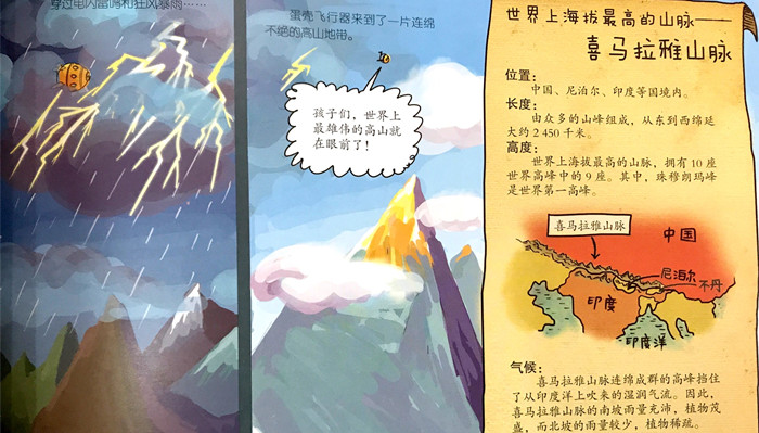 《蛋蛋学校爆笑科普探秘系列》共24册,用绘本的形式创作了《出发!可爱的虫虫世界》《出发!奇妙的自然险境》《出发!不可思议的太空》三个专辑,讲述蛋蛋学校的12个蛋族小伙伴,在师傅太极龟的带领下,通过神奇的蛋壳飞行器、时光机等装置,来到昆虫世界、沙漠海洋、月球太空……经历了各种爆笑、惊险、有趣的冒险,在一次次探秘中了解了万物的奥秘。第一辑内容包括8册:《向喜马拉雅进发》《挑战极限高度》《神秘的地下世界》《洞穴里的新发现》《穿越时间机器》《沙漠奇遇记》《失踪的“大嘴号”》《逃出虎鲨的肚子》,带领小读者经历自然世界里各种惊险有趣的冒险,从中了解大自然的奥秘,认识更广阔的世界。以《沙漠奇遇记》为例,除了吸引人的故事,贯穿其中的知识点有:沙漠的形成、沙尘暴的危害、沙漠气候、雨的形成、沙漠绿洲的建造、沙漠里的动植物、沙漠宝藏等等。是一部适合学龄前至小学生中低年级阅读的优秀趣味科普读物。