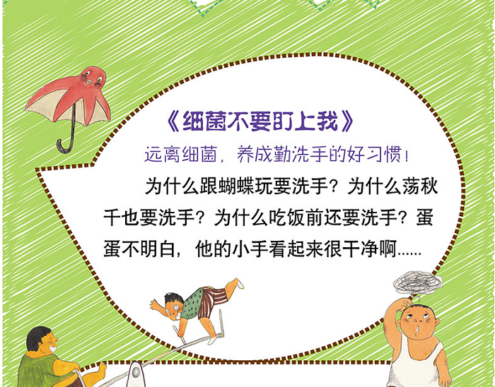 “宝宝,记得要洗手哦!”“为什么呀?”“因为要吃饭啦!”“宝宝,记得要洗手哦!”“为什么呀?”“因为你刚刚便便过。”“宝宝,记得要洗手哦!”“为什么呀?”“因为你跟蚂蚁玩了很久。“妈妈,为什么要洗手啊?我的小手干净得就跟新的一样啊!”“因为有细菌啊。”“哇,原来它们这么小啊!”抹上洗手液,搓一搓,冲一冲,细菌不见啦!哇,宝宝的手香香的、滑滑的,小细菌们搬家啦!