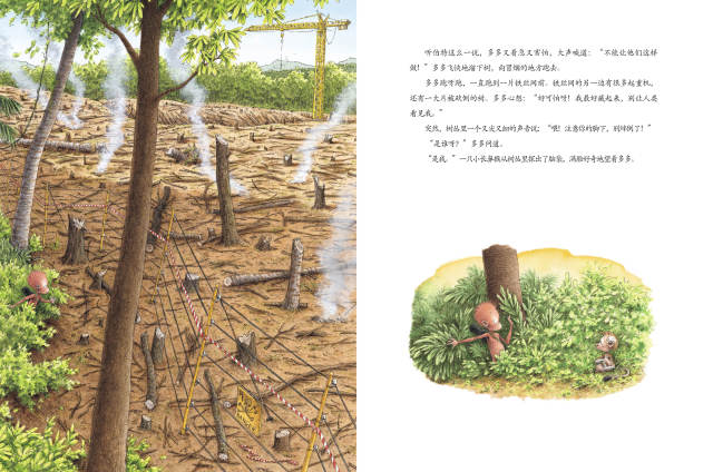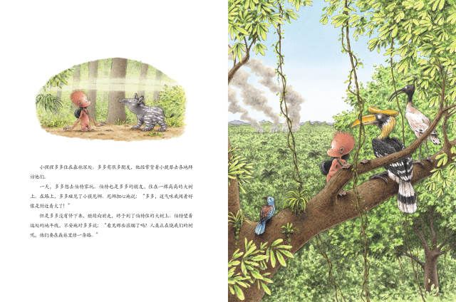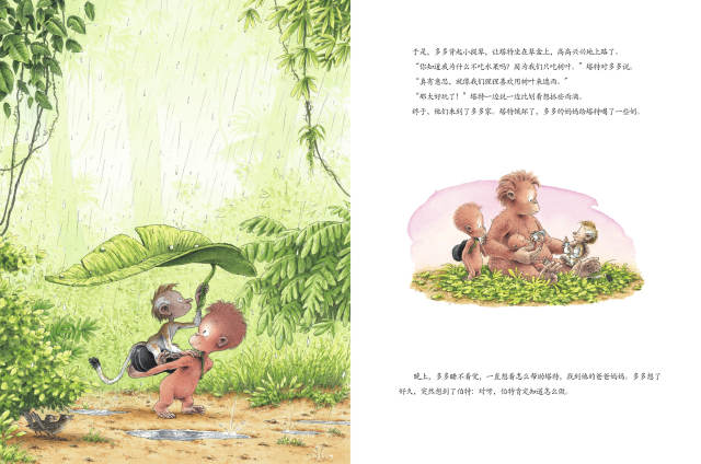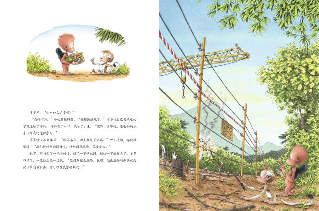 作者没有简单地讲述故事,而是在故事之中融入自然风物的描写,比如大森林的远景,参天大树,奇花异草,还有让多多在森林里荡来荡去的树藤,多多在森林里的游历,与小貘尼娜,巨嘴鸟塔特,长鼻猴伯特之间的友谊和关爱,作者娓娓道来,像是在讲述自己熟知的朋友。