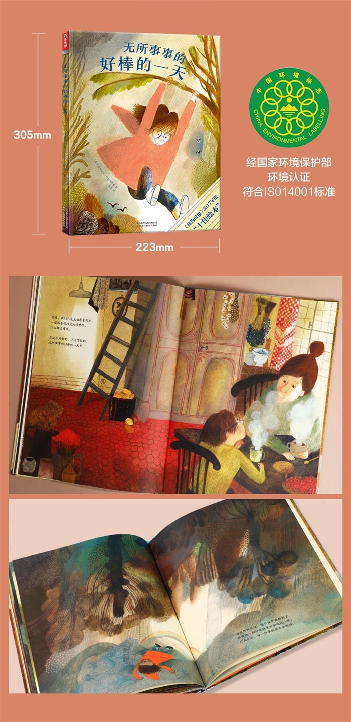 获奖信息 《纽约时报》2017年度“十佳绘本”。这本书除了荣获《纽约时报》2017年度“十佳绘本”的奖项,还获得了诸多奖项,比如:2016年法国朗代诺奖(Winner of the Landerneau Prize as Best book of 2016)、法国穆兰“Winner of the Grand prix de l'illustration”、2017美国插画家协会金奖(Gold medal of the Society of illustrators)。 1.荣获《纽约时报》2017年度“十佳绘本”的奖项、2016年法国朗代诺奖、2017美国插画家协会金奖; 2.《无所事事的好棒的一天》版权已输出至意大利、瑞典、美国、英国、西班牙、希腊、德国等多个国家; 3.《无所事事的好棒的一天》的作者贝娅特丽丝·阿勒玛尼娅是意大利著名图画书作家,曾获得意大利安徒生奖年度*插画奖; 4.插画中存在的大量细节,展示出丰富的想象力,让孩子们仿佛身临其境,进入了奇幻的森林,展开一天的冒险。