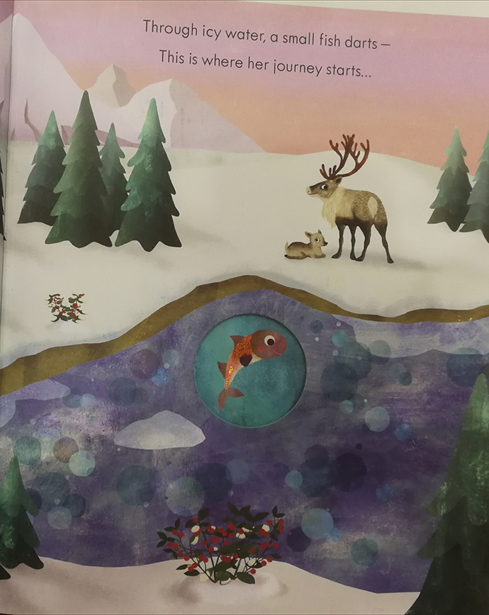 一条小鱼在高山上的浮冰中飞奔,它的征途是星辰大海!这是多么不可思议的事情。但这只小鱼做到了。从高山到草原、从白天到黑夜、从风雪到晴雨、从冬到夏,小鱼要完成它的旅程。一路上,它还认识了各种各样的小动物:白色的雪雁、谨慎的小鹿、忙碌的海狸、嗥叫的猫头鹰、嬉戏的小熊..孩子们能跟着小鱼的旅途认识15种动物,还能了解到它们的居住环境和生活习性。