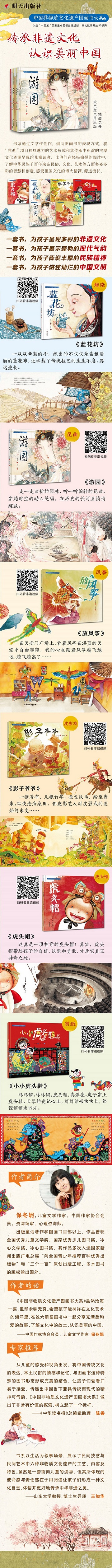 这是一套关于中国非物质文化遗产的图画书的系列绘本。共分虎头帽、游园、影子爷爷、蓝花坊、小小虎头鞋、放风筝等。