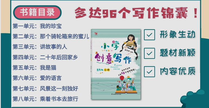 长辫子老师领衔主编,紧扣单元习作主题, 6个年级,12册,96个单元,96个写作锦囊! 它们是提升写作成绩的法宝,更是建立在儿童的精神世界、话语方式和生长需要基础上的创意写作世界。