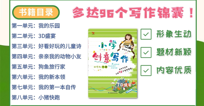 长辫子老师领衔主编,紧扣单元习作主题, 6个年级,12册,96个单元,96个写作锦囊! 它们是提升写作成绩的法宝,更是建立在儿童的精神世界、话语方式和生长需要基础上的创意写作世界。