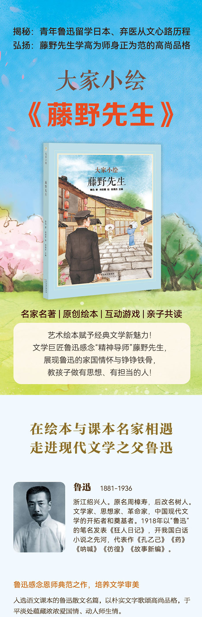 入选课文的鲁迅经典散文原文绘本,提前学习,涵养文学素养。 看现代文学巨匠鲁迅感念“精神导师”藤野先生, 展现鲁迅的家国情怀与铮铮铁骨,教孩子做有思想、有担当的人!