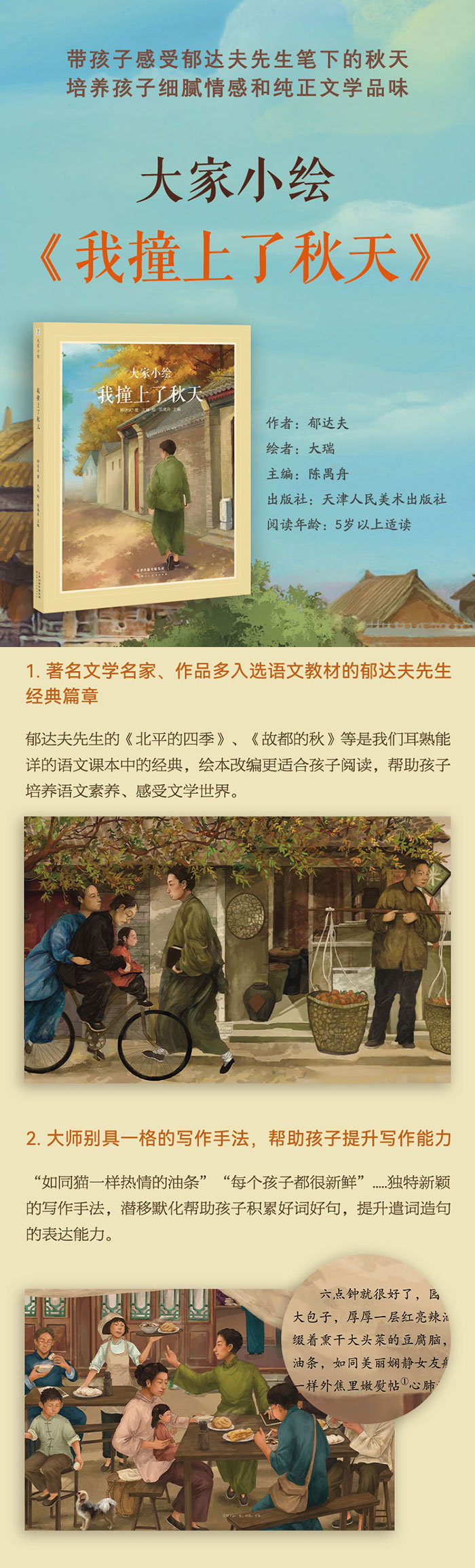愿意“用生命的三分之二”去换取秋天的郁达夫先生 用浓烈的情感、诗意的感受和妙趣横生讲述,给我们《故都的秋》之后又一个秋天 和文学大家郁达夫一起与秋天“相撞”,帮助孩子亲近文学,启发对文学、写作和艺术的畅想