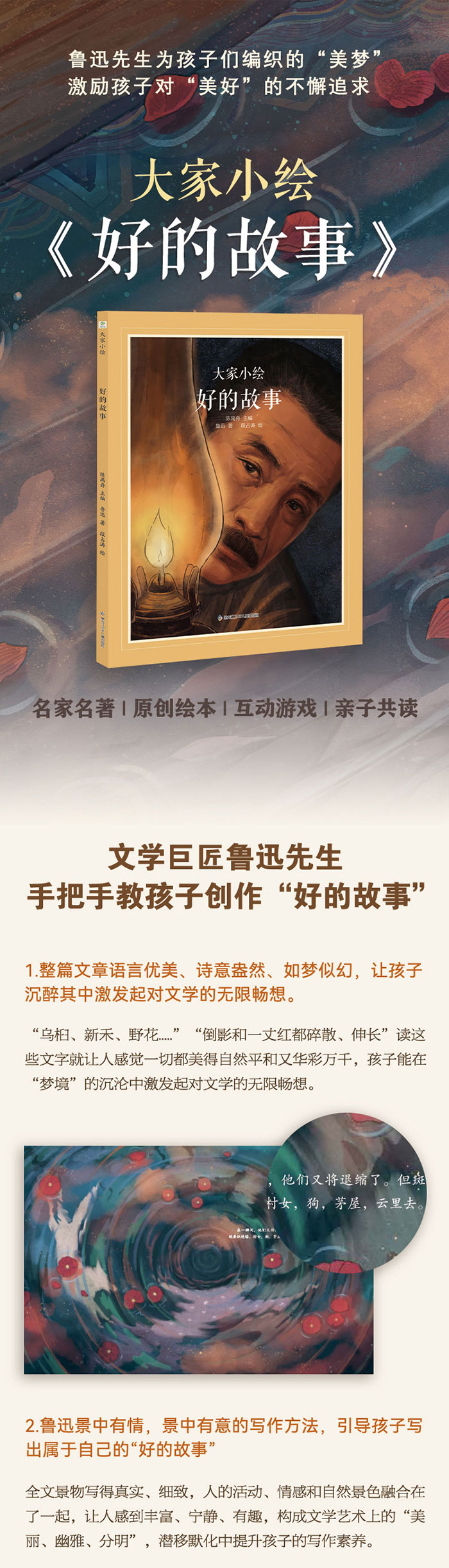 01整篇文章语言优美、诗意盎然、如梦似幻,让孩子沉醉其中激发起对文学的无限畅想。 02鲁迅景中有情,景中有意的写作方法,引导孩子写出属于自己的“好的故事” 03入选语文教材的阅读经典文学,帮助孩子从小培养大语文下的文学阅读和写作能力。 04水彩插画全新演绎经典文学,帮助孩子结合插画去感受、理解这个如同诗一般的故事。 05绘本语言诠释文字内容,图、文结合相得益彰,身临其境感受文学魅力。 06“导读”指路,解析主题,联系孩子现实生活,深入品读名家名作。 07“思维导图”梳理全文,巩固阅读成果,训练“整本书阅读”思维。 08“小百科”认识历代文人、画家的“宠儿”,拓展知识视野。 09“互动游戏”检验阅读成果,锻炼观察力与思维力,读每一本都有进步。