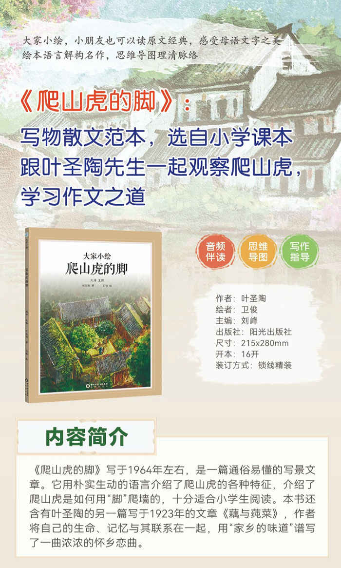写物散文范本,选自小学课本; 跟叶圣陶先生一起观察爬山虎,学习作文之道; 阅读经典,提高鉴赏美的能力,培养发现生活中美的眼光; 笔触生动,活灵活现,将文本视觉化,带你观赏爬山虎、尝藕、品莼菜;