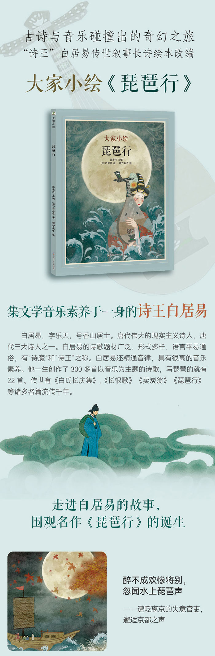 与李白、杜甫齐名的唐代大诗人白居易,《长恨歌》后另一扛鼎之作! 唐代新乐府诗代表作,古代音乐描写文学艺术典范——《琵琶行》绘本改编! 艺术再现“嘈嘈切切错杂弹,大珠小珠落玉盘”音乐现场,感受诗歌文学和传统民乐魅力。 “同是天涯沦落人,相逢何必曾相识!”图画故事了解“诗王”白居易的世事感慨和悲悯情怀。