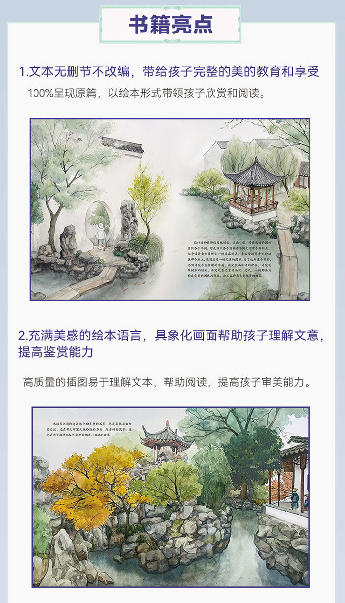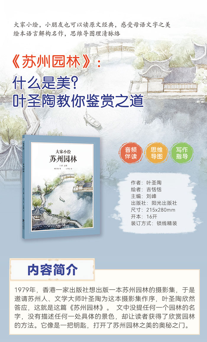 苏州人、文学大师叶圣陶教你如何鉴赏什么是美; 阅读经典,提高鉴赏美的能力,培养发现生活中美的眼光; 笔触细致,画风恬淡,将文本视觉化展现,带你游览纸上园林; 同系列绘本已销百万册;